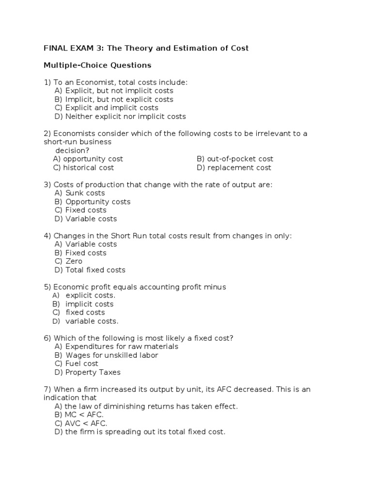 The type of machinery a company uses depends on its particular industry. They tend to be recurring, such as interest or rents being paid per month. 15 which motive is most likely to increase the wish to open a savings account? I figured out that the disquietude i saw on so many faces was more likely to be fixed on faces that didn't look like mine. For example, if you produce more cars, you have to use more raw materials such as metal. (c) a kansas wheat farm; Depreciation is a fixed cost since it wont vary based on sales q2: · going is more likely if the prediction has been made previously , and so now it is a plan. The cards are meant to be seen as a digital flashcard as they appear double sided, or rather hide the. Many scouting web questions are common questions that are typically seen in the classroom, for homework or on quizzes and tests. In the short run, at least one input is fixed, but in the long run, the firm can vary all inputs. Under which of these market classifications does each of the following most accurately fit? All sunk costs are fixed, but not all fixed costs are considered sunk.